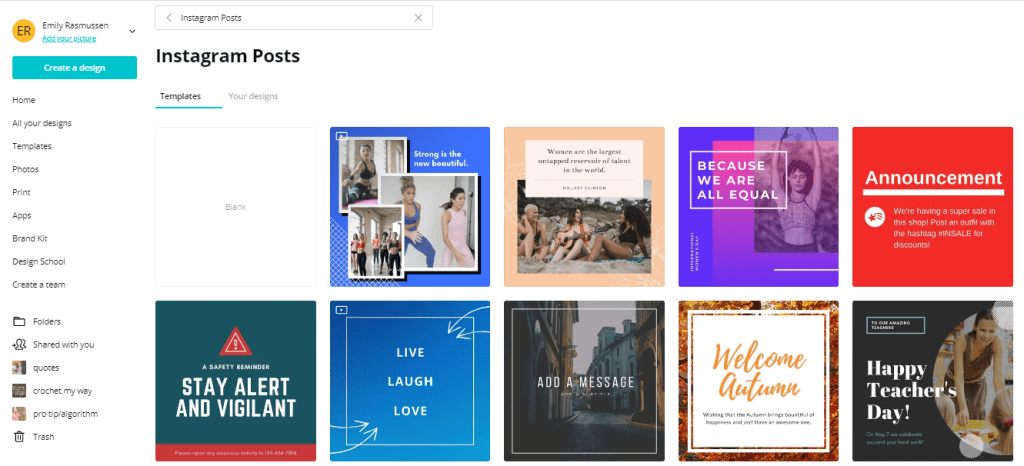 Canva is a free (with a premium option) app that lets you design for a lot of different purposes. You choose what you’re creating (like a Pinterest Pin, and Instagram Post, or a Facebook Cover Image), and then you can scroll through template suggestions and pick something that has a look you’re going for. It looks something like this: